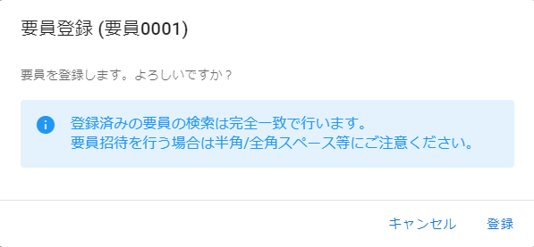 要員招待機能が有効な場合は、要員登録確認ダイアログに下記のヒントが表示されます。