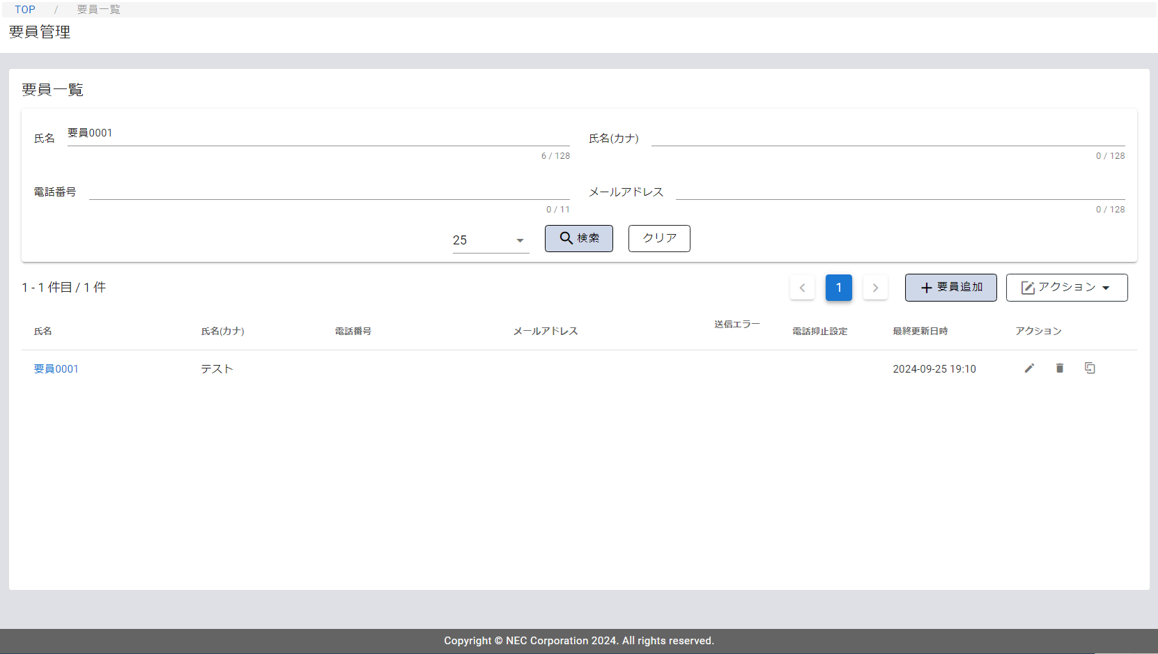 - 登録済みの要員の検索は完全一致で行うため、半角/全角スペース等にご注意ください。