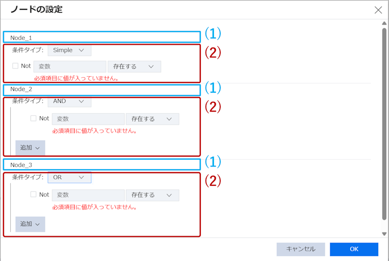| (2) | 分岐条件 | (1)に表示されたノードへ分岐する条件を設定するエリアです。 |