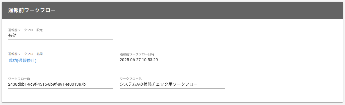 ワークフローによって通報停止が行われた場合は、エスカレーション履歴詳細の通報前ワークフロー結果に「成功(通報停止)」と表示されます。
