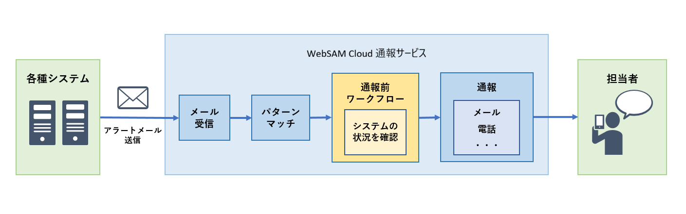 通報前ワークフローはシステムにおけるインシデントや障害が発生した際に、自動的にシステムの状況を判定して WebSAM Cloud 通報サービス による通報の有無を決定することができる機能です。