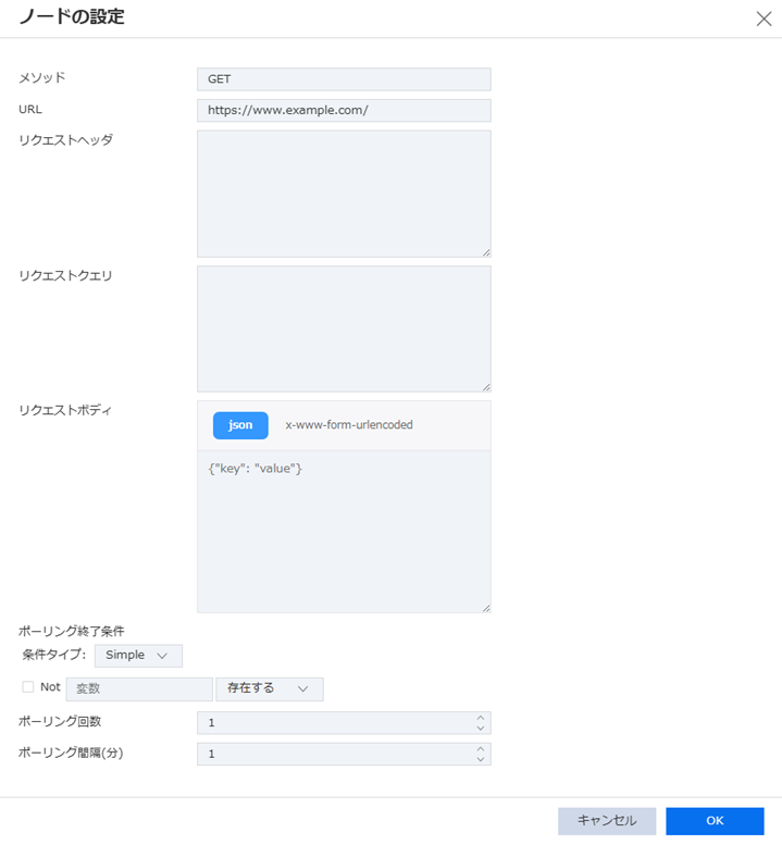 | ポーリング終了条件(変数名) | ○ | $.self.body.<キー>※$.self.status$.input.*$.results.<ノード名>.status$.output(<ノード名>).<キー>※ | ポーリング専用の$.self.*が使用可能 |