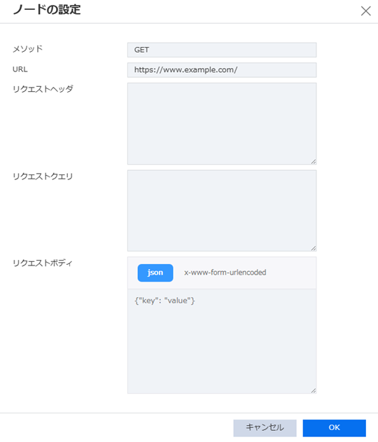 | リクエストクエリ | ○ | Key,Value形式$.input.*$.output(<ノード名>).<キー>※ | Key: 英数字、 -、_、参照形式(.$)のみ利用可能Value: 固定値またはJSONPath式を指定可能 |