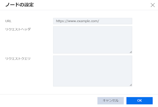 | URL | ○ | http(s)://~ 形式$.input.*$.output(<ノード名>).<キー>※ | 固定値またはJSONPath式で指定可能 |