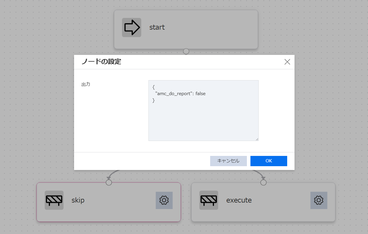 | 分岐条件(変数名) | ○ | $.input.*$.results.<ノード名>.status$.output(<ノード名>).<キー>※ | 条件評価に使用する変数を指定 |