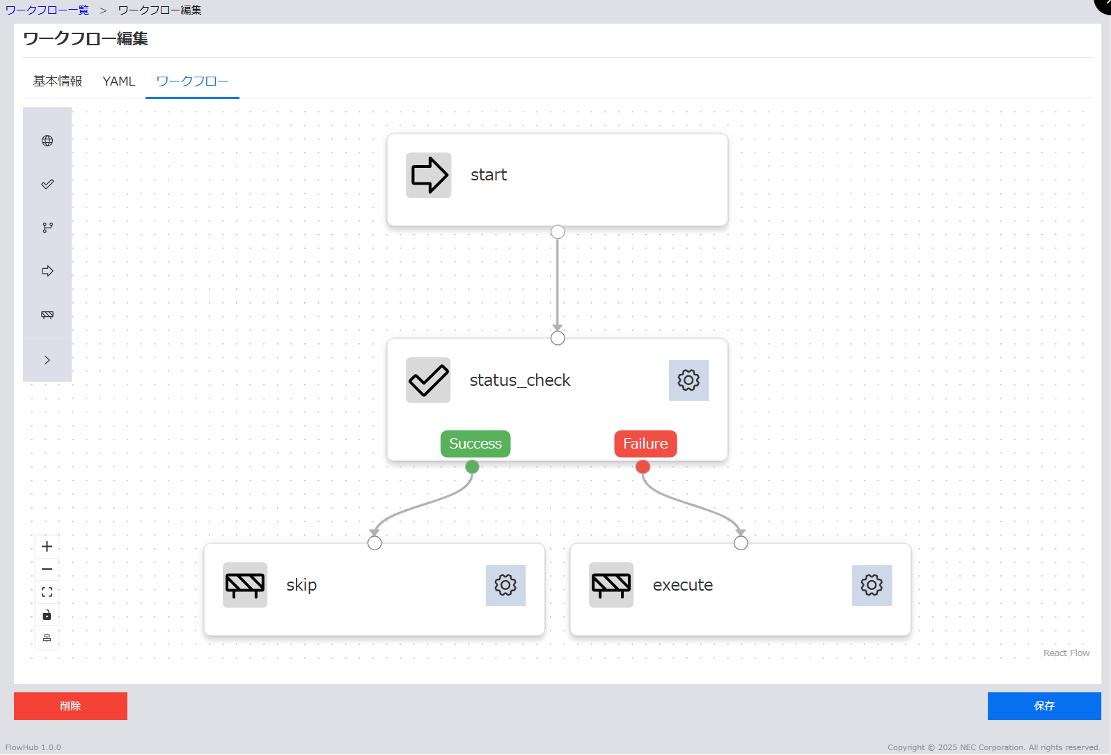 | (5) | 接続ライン | ノード間の接続です。タスクの実行順序や分岐を表現します。 |