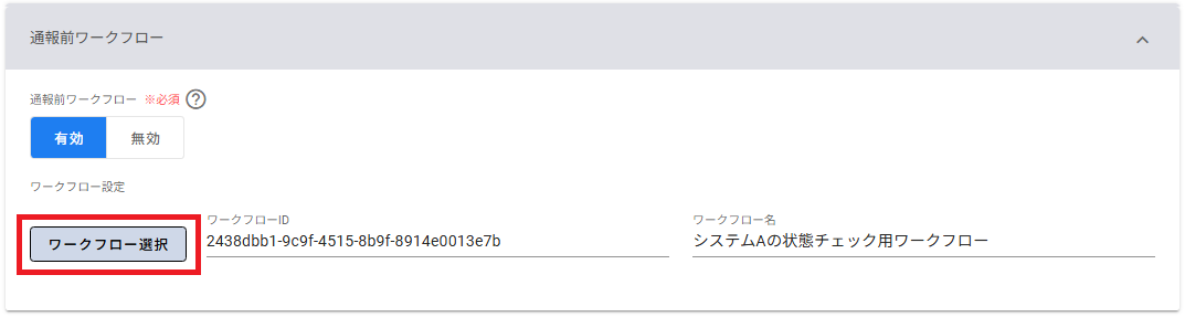 パターンの通報前ワークフローとして指定する場合は、ワークフロー一覧テーブルの選択ボタンを押下してください。
