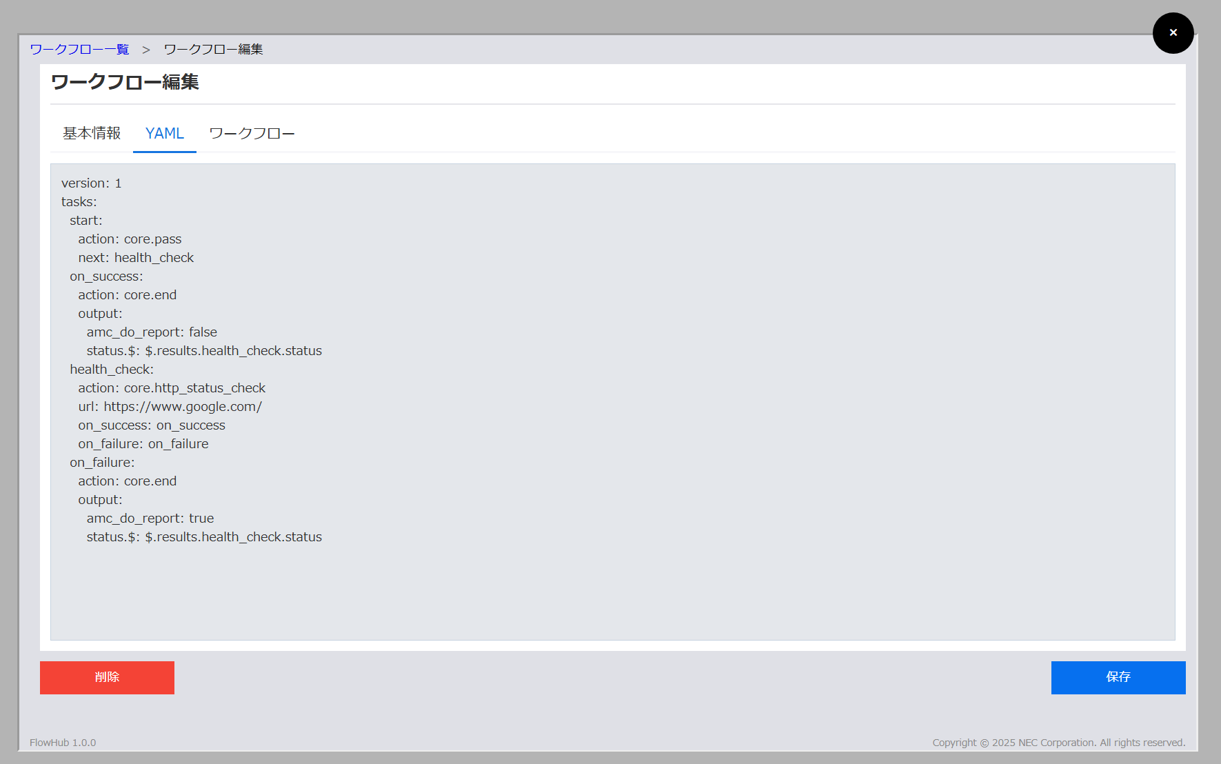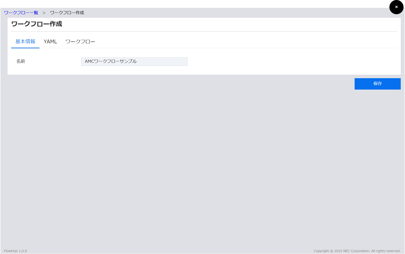 ワークフロー登録、編集画面は「基本情報」、「YAML」、「ワークフロー」の3つのタブで構成されます。
