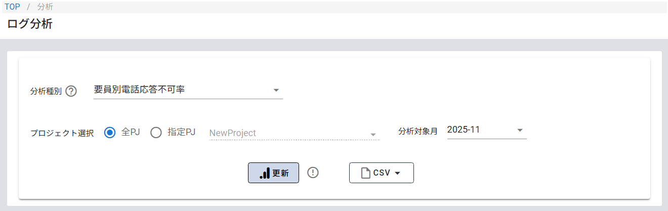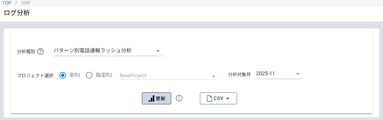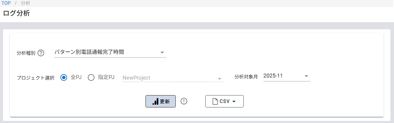 分析種別分析したい種別を選択します。現在は「パターン別電話通報完了時間」「パターン別電話通報ラッシュ分析」「要員別電話応答不可率」をサポートしています。