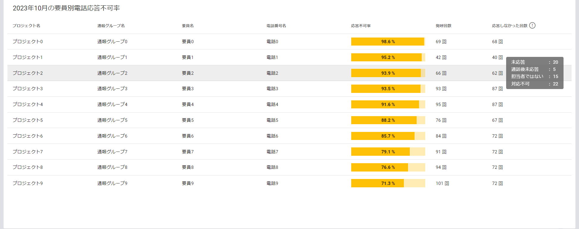 応答しなかった回数対象月の当該電話番号への発呼に対して対応可能以外の回答を行った回数マウスホバーにより内訳を表示できます。