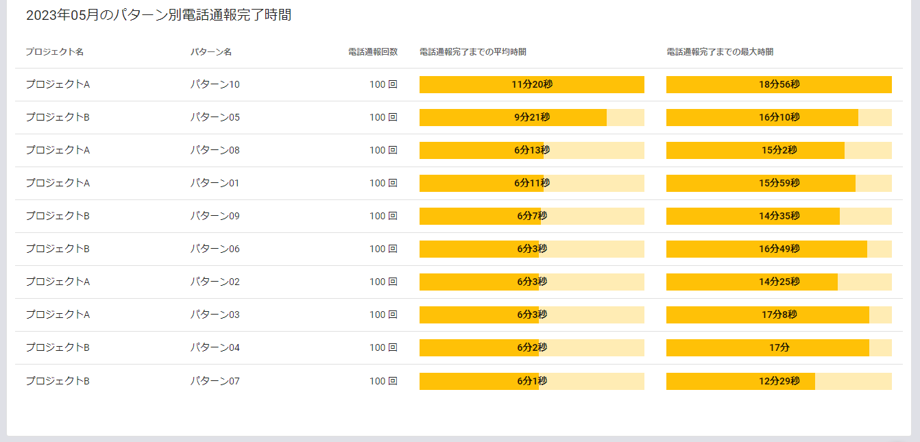 パターン別に電話通報にかかった時間(発呼から応答完了またはリトライオーバーまで)の平均時間のワースト10を表示します。