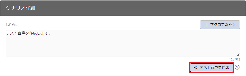 - 音声案内の登録・編集時に、音声案内のシナリオ詳細に音声案内テキストを入力して「テスト音声を作成」をクリックします。