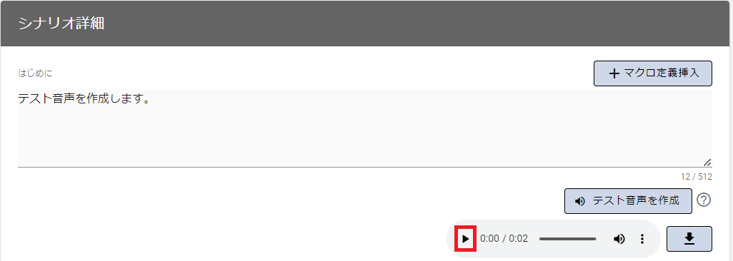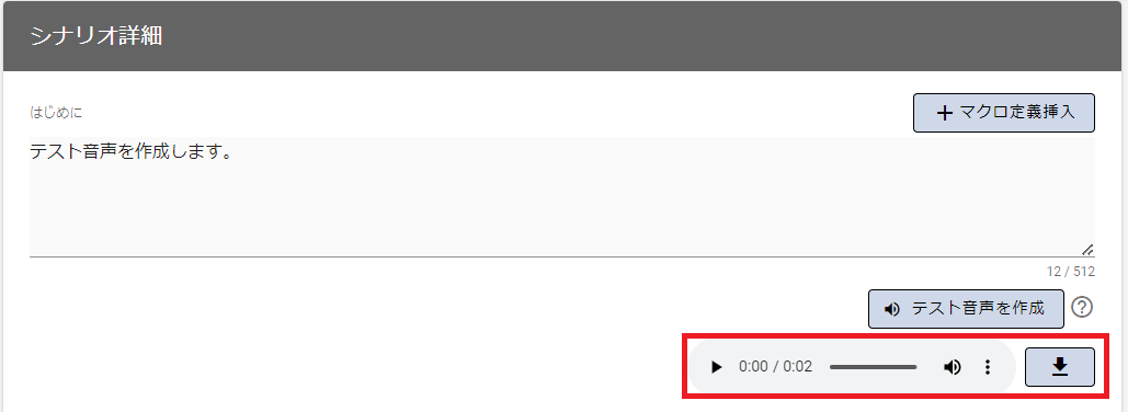 - テスト音声の作成が完了すると「音声コントロールバー」と「音声ダウンロード」アイコンが表示されます。
