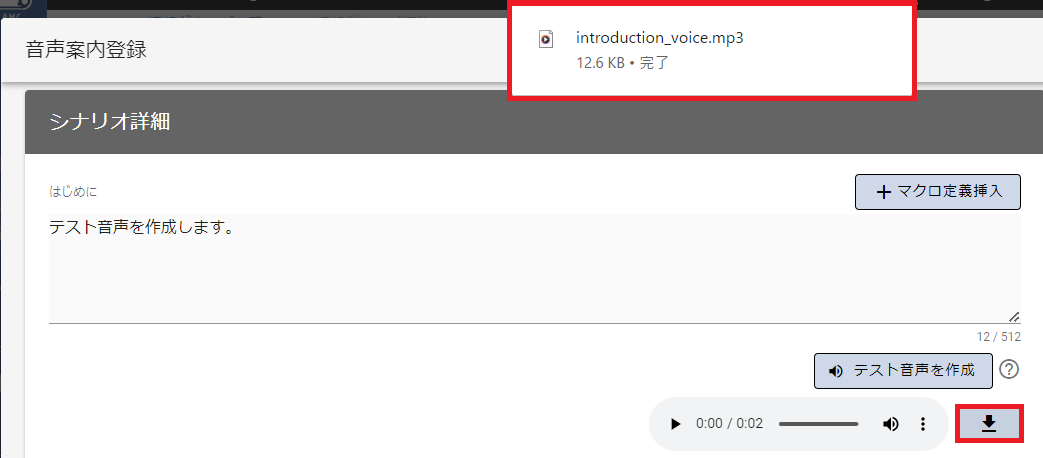 テスト音声の作成後、「音声ダウンロード」アイコンクリックするとテスト音声をMP3ファイルとしてダウンロードすることができます。