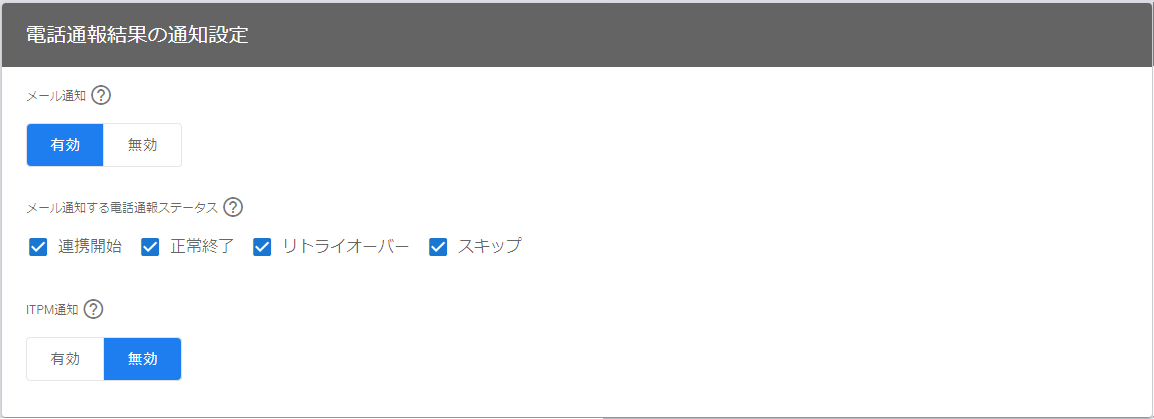 | ITPM通知 | 電話通報時に応答結果をITPMまたはITSMへのインシデントへ連携するかどうかを指定します。 「有効」の場合、電話通報の応答内容をITPMまたはITSMのインシデントに対して内部コメントとして登録します。 「無効」の場合は応答結果の送信はされません。 |