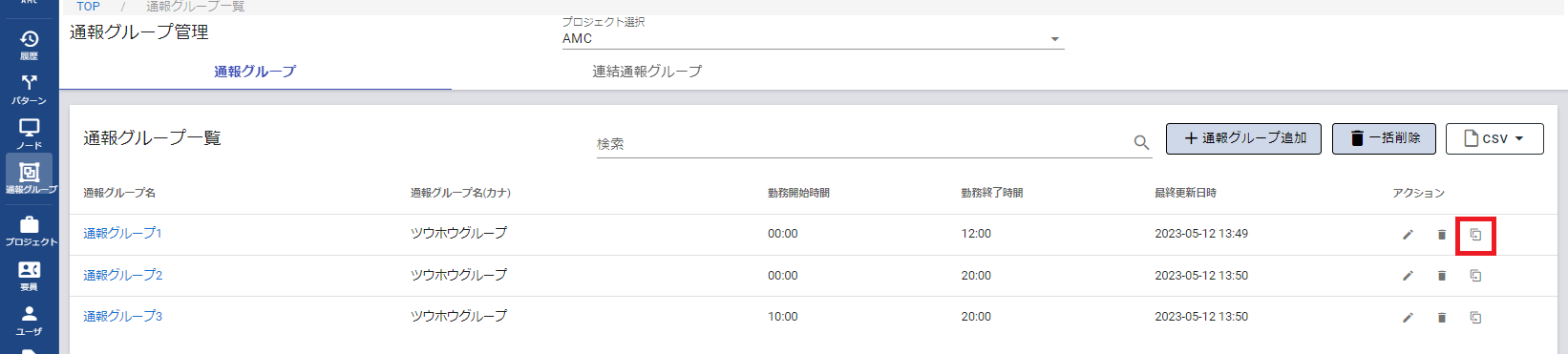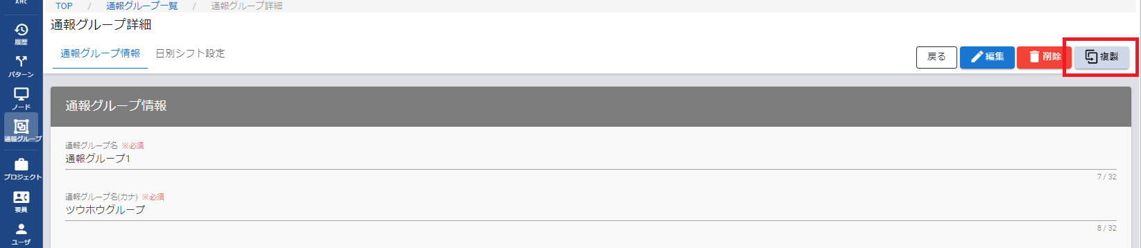 通報グループの複製は通報グループ一覧画面、または通報グループ詳細画面から行うことができます。