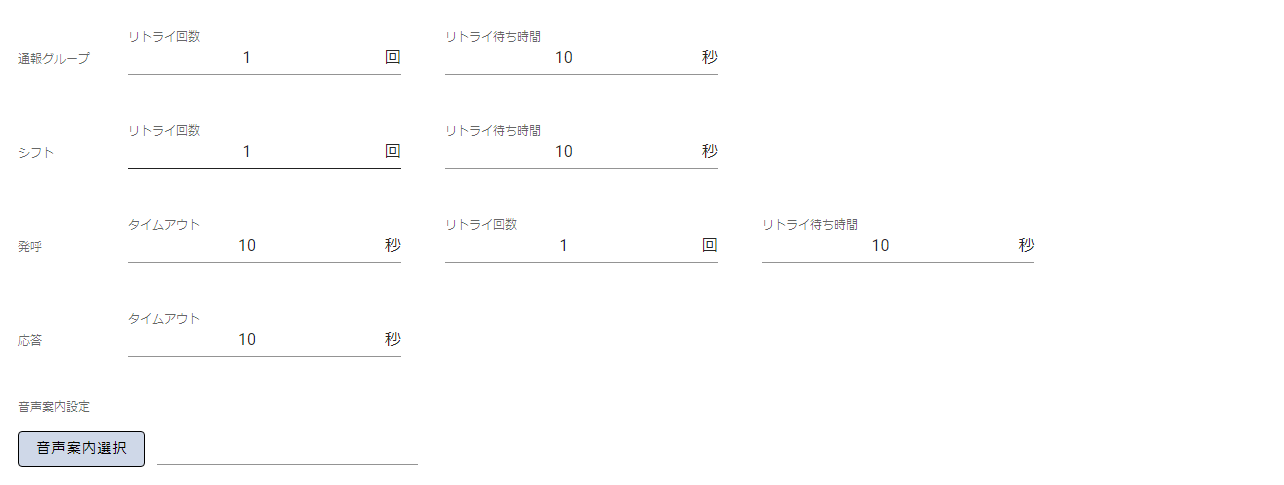 | (通報グループの)リトライ回数 | グループ単位での通報リトライ回数を指定します。 | グループ(シフト全体)でのリトライになります。 |