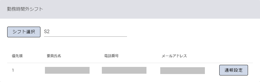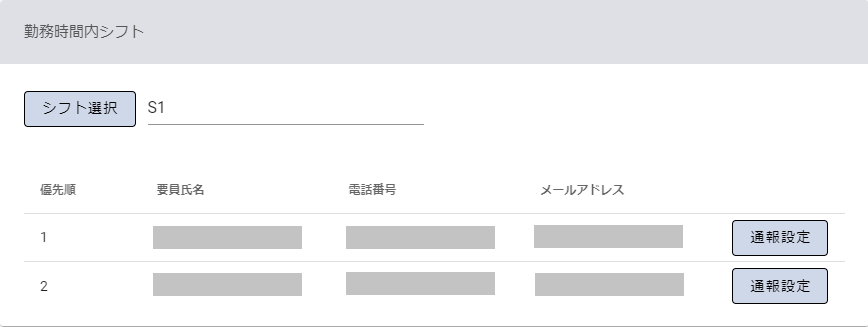 | 通報設定 | シフトに割り当てた要員の電話番号、及びメールアドレスの使用の有無や電話順を勤務時間別に設定します。 | |