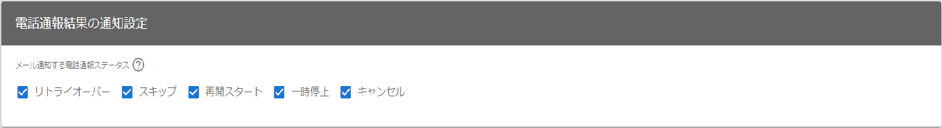 | メール通知する電話通報ステータス | どの電話通報ステータスをメール通知するかを選択します。 | 電話通報ステータスに関しては、電話通報結果のメール通知 を参照してください。 |