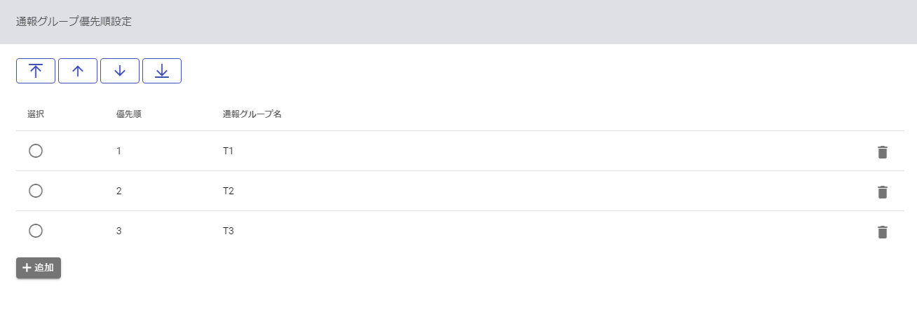 | 選択 | 通報グループを選択して画面上部の矢印を指定することで、通報グループの優先順を変更できます。優先順の高い通報グループから電話を発信します。 |
