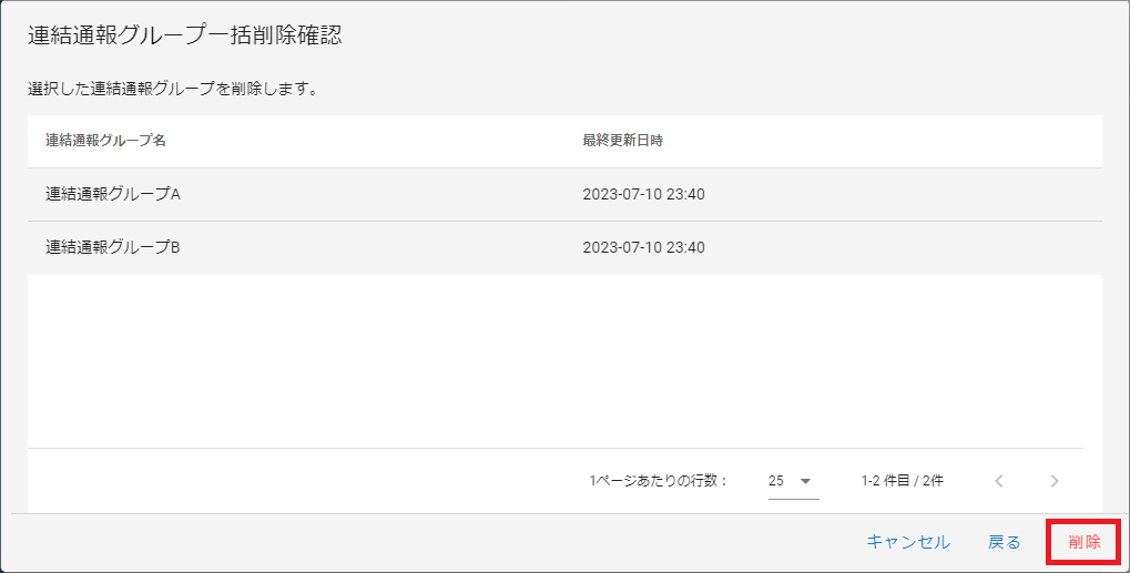 - 一括削除の確認画面が表示されるので、選択した連結通報グループに問題なければ「削除」をクリックします。