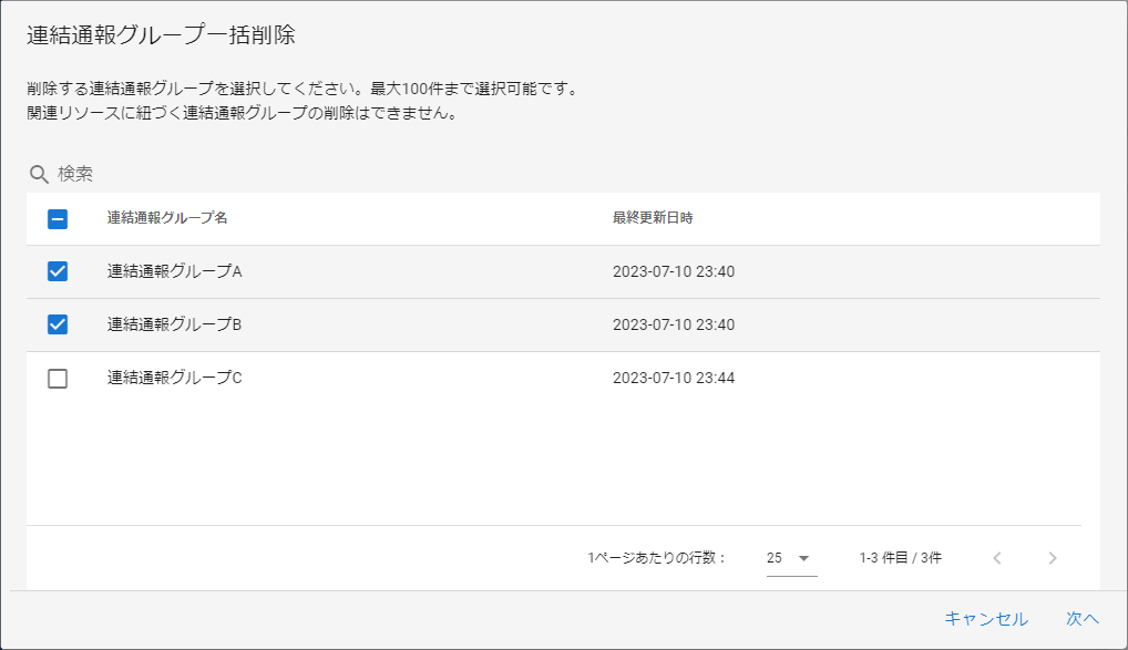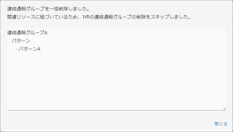 一括削除に指定した通報グループの中に連結通報グループやパターンなどの関連リソースに紐づく通報グループが含まれている場合は、該当する通報グループの削除をスキップし、それ以外の通報グループの削除は行います。