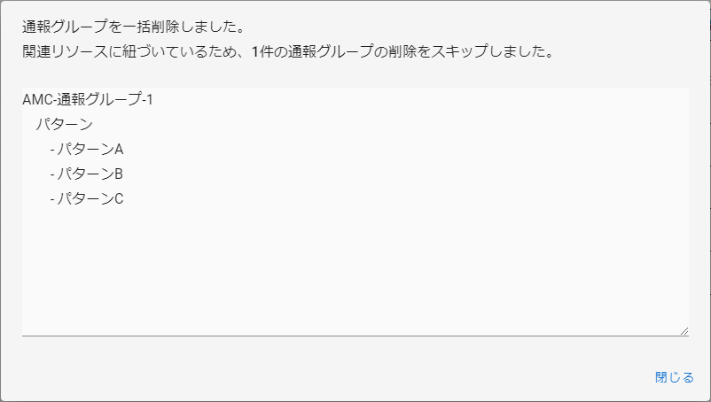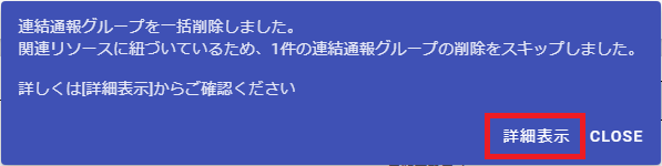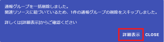 関連リソースに紐づく通報グループが含まれていた場合は、一括削除完了後に一部の通報グループの削除をスキップしたことが通知されます。