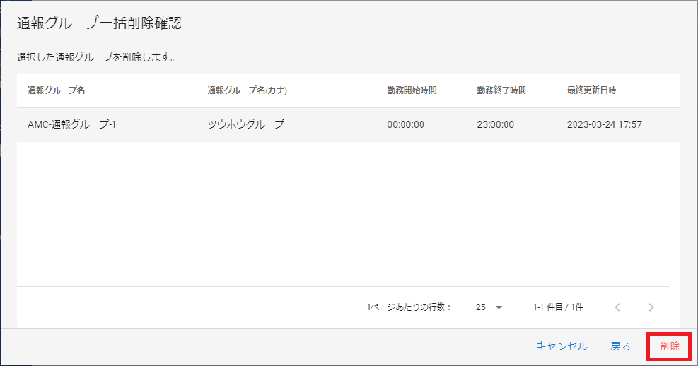 - 一括削除の確認画面が表示されるので、選択した通報グループに問題なければ「削除」をクリックします。