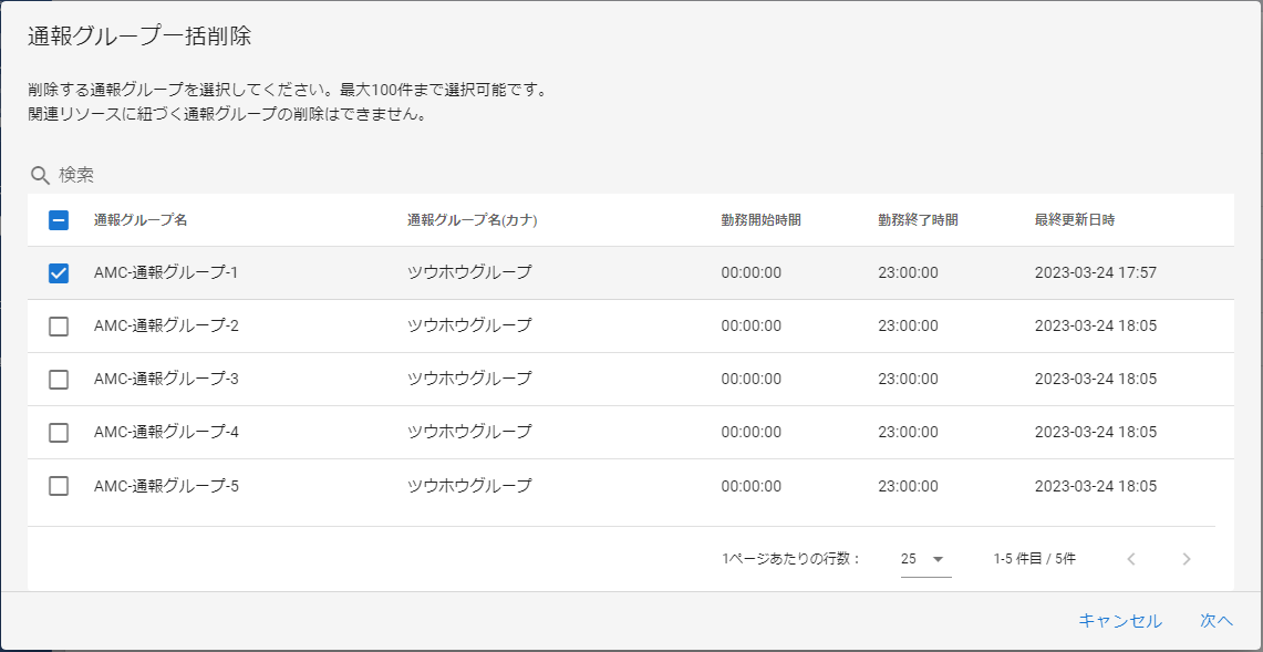 複数の通報グループを一括で削除することができます。 一括削除では最大100件の通報グループを削除することができます。