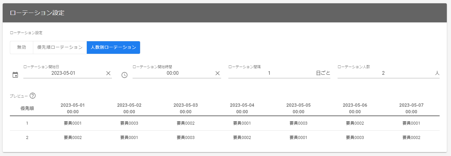 | ローテーション間隔 | 「優先順ローテーション」または「人数別ローテーション」を何日間隔で行うかを指定します。 | 「優先順ローテーション」または「人数別ローテーション」を有効にした場合は必須項目となります。 |