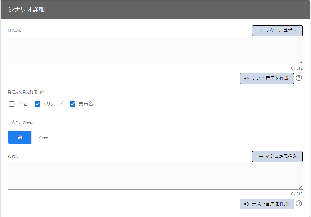 | 終わり | 電話を切る前の挨拶情報を指定します。 | 既定の音声案内は以下です。 「電話通報は以上です」 ※マクロ設定 を使用して通報内容のカスタマイズが可能です。マクロ挿入に関しては、マクロ定義挿入画面 を参照してください。 ※テスト音声を作成して音声案内を試聴できます。電話音声テストに関しては、電話音声テスト を参照してください |