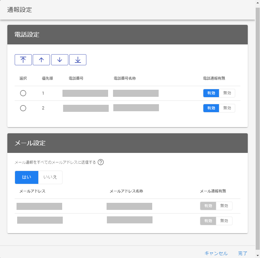 | メール通知 | 電話通報時に通報結果をメールで通知するかどうかを指定します。 「有効」の場合、電話通報の開始時と終了時に要員のメールアドレス宛にメールでお知らせします。 「無効」の場合はメールを送信しません。(開始時も送信されません。) | |