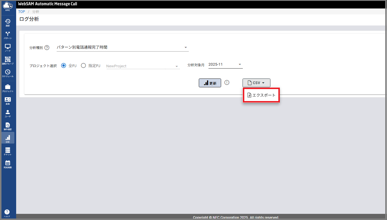 1. 画面左のメニューバーから、「分析」を選択して、「CSV」プルダウンメニューから「エクスポート」をクリックします。