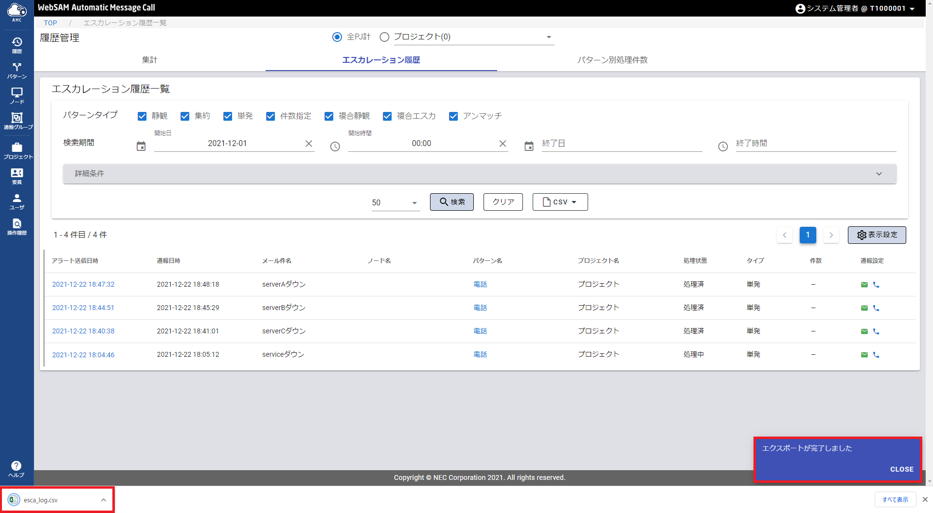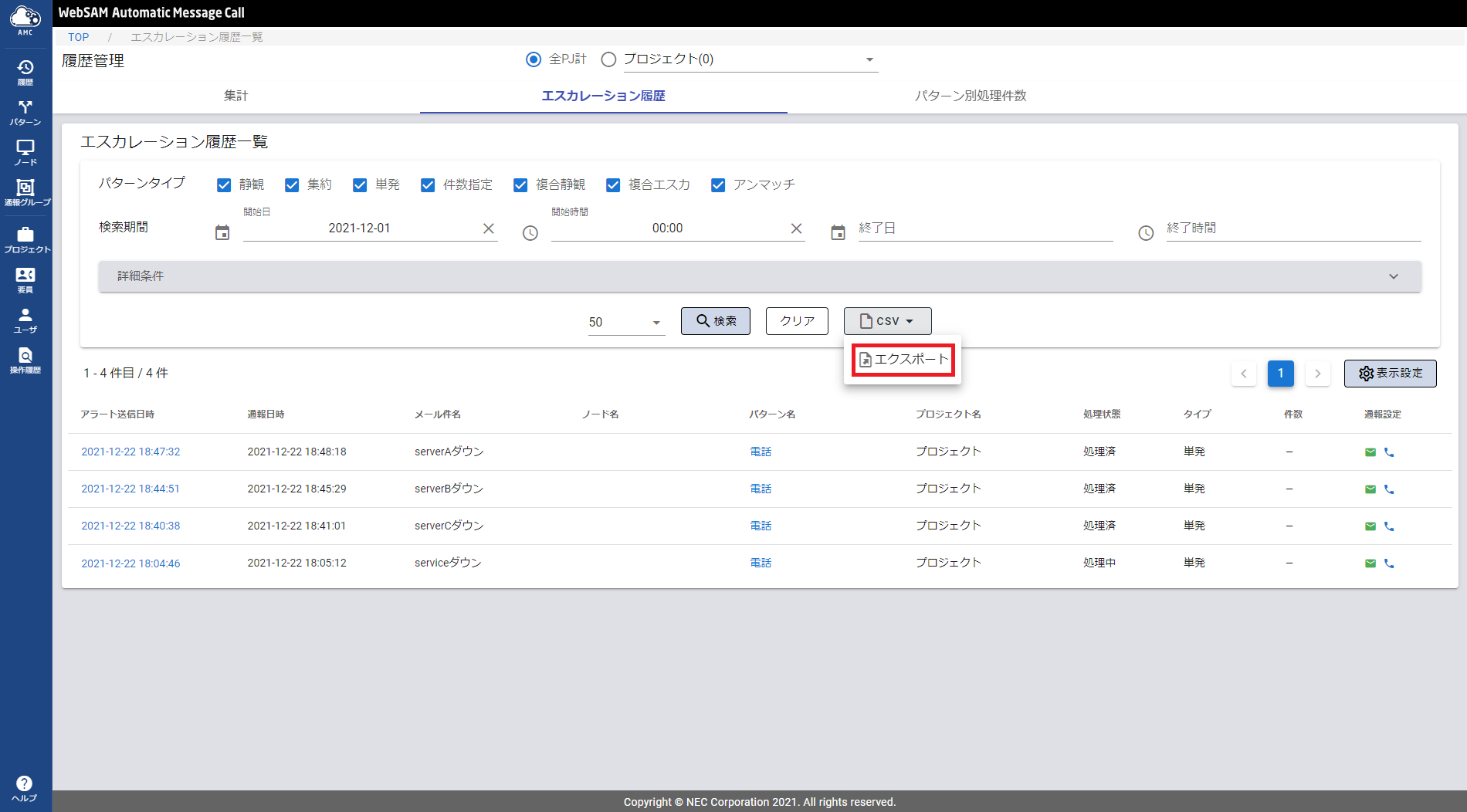 WebSAM Cloud 通報サービスで管理する操作履歴情報は、エクスポート機能により、CSV形式ファイルで出力が可能です。