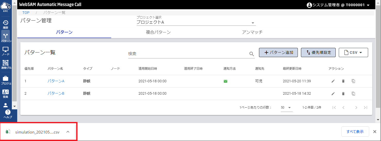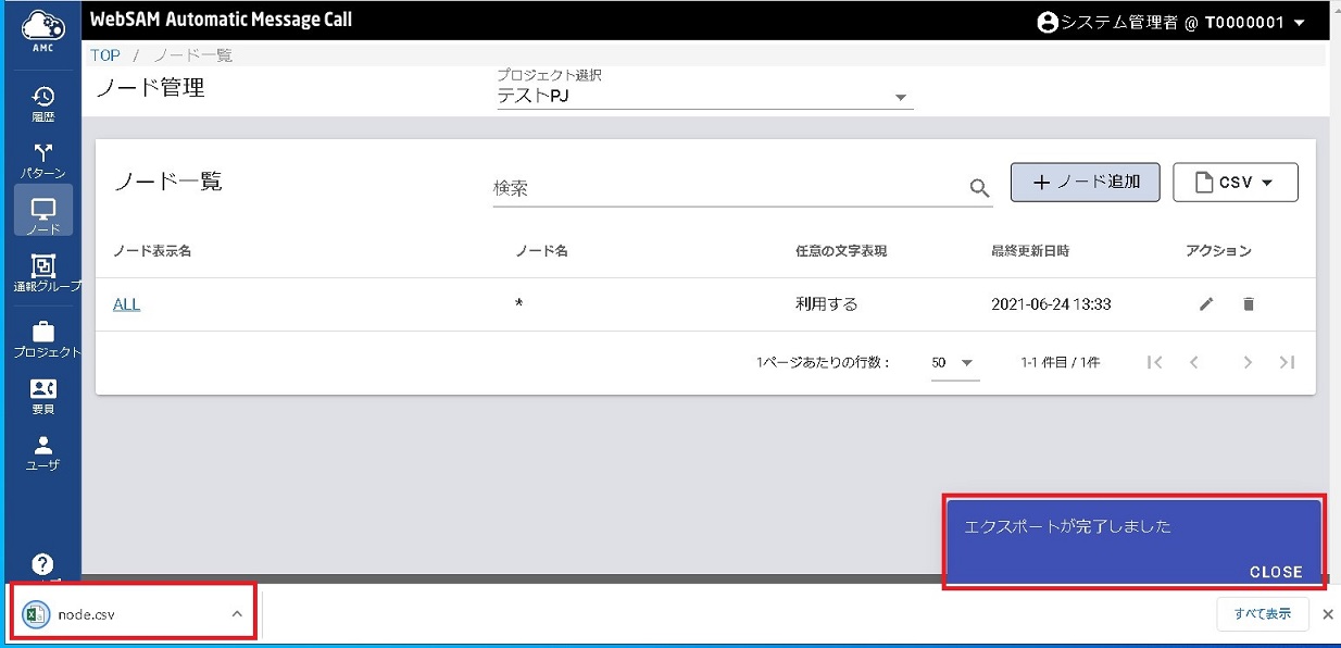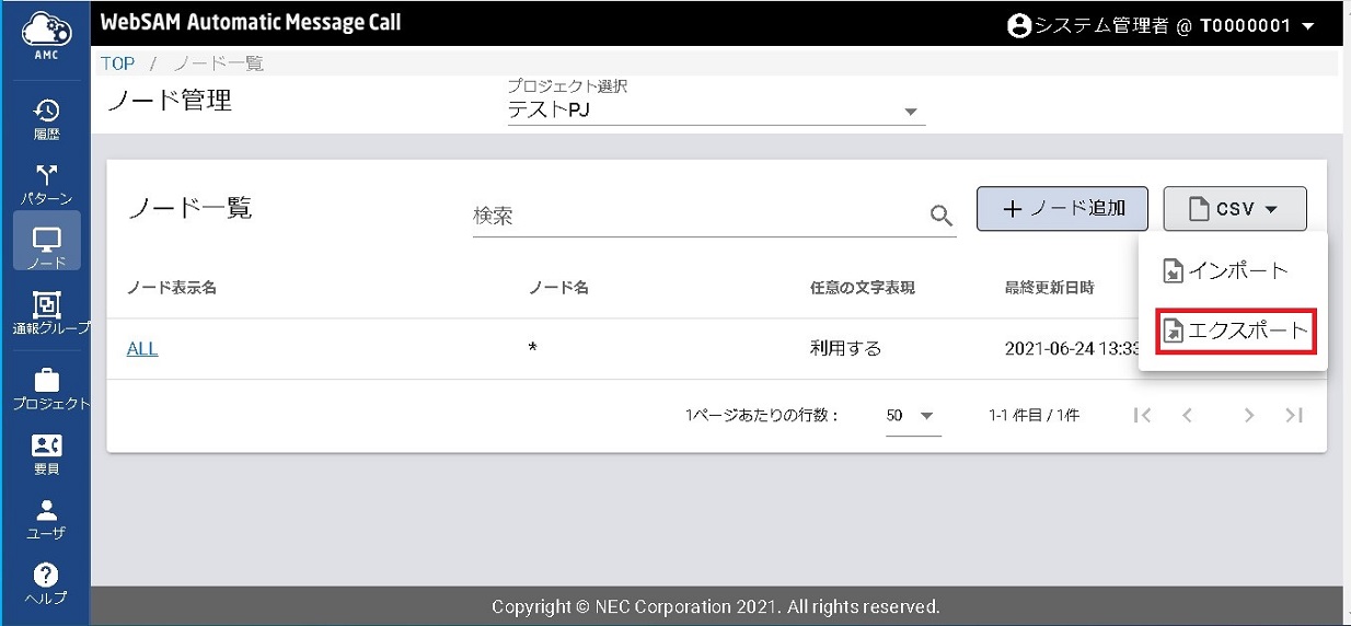 1. 画面左のメニューバーから、「ノード」、「要員」、「パターン」(複合パターンの場合は、更に「複合パターン」タブを選択)、「通報グループ」、「プロジェクト」、「ユーザ」のいずれかを選択して、管理画面を開き、画面右上の「CSV」プルダウンメニューから「エクスポート」をクリックします。