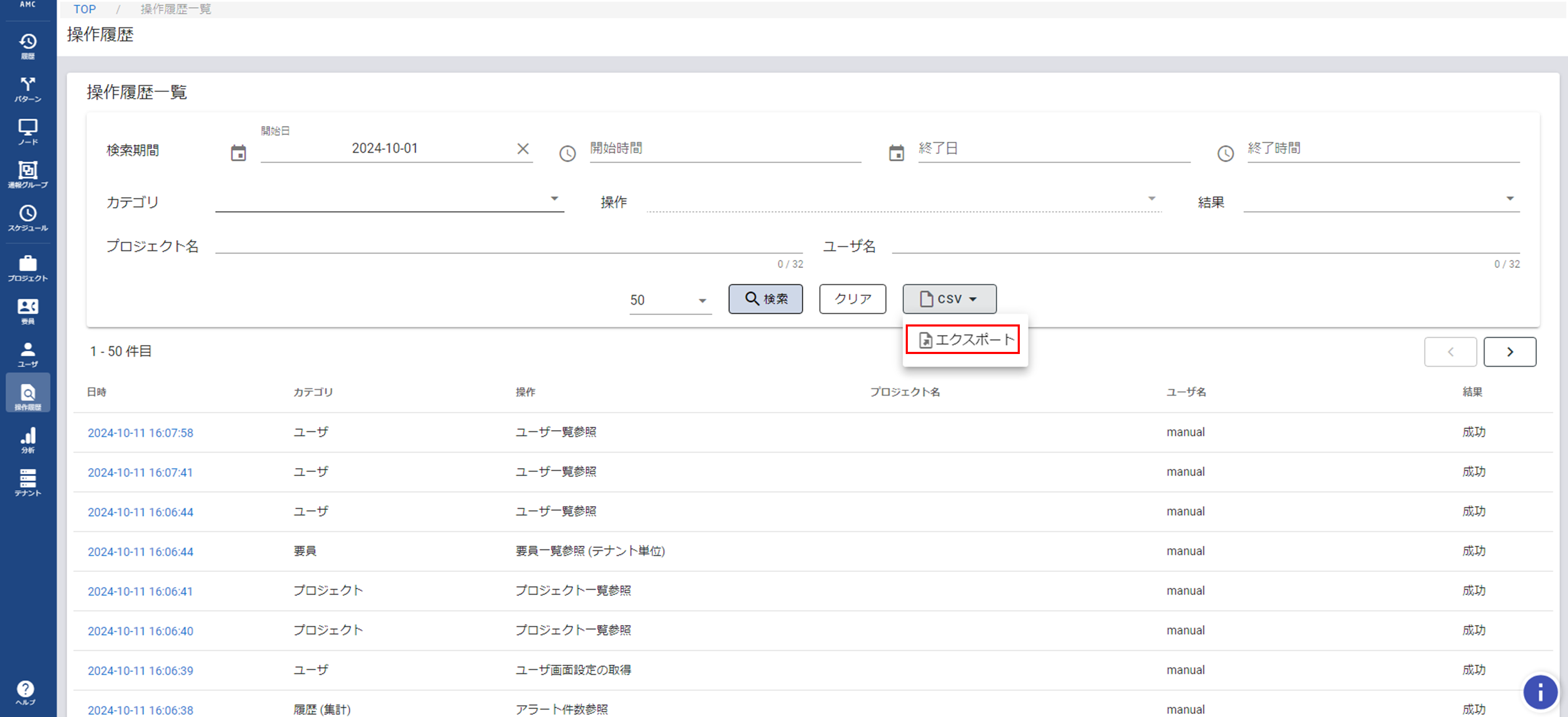 1. 画面左のメニューバーから、「操作履歴」を選択して、「CSV」プルダウンメニューから「エクスポート」をクリックします。
