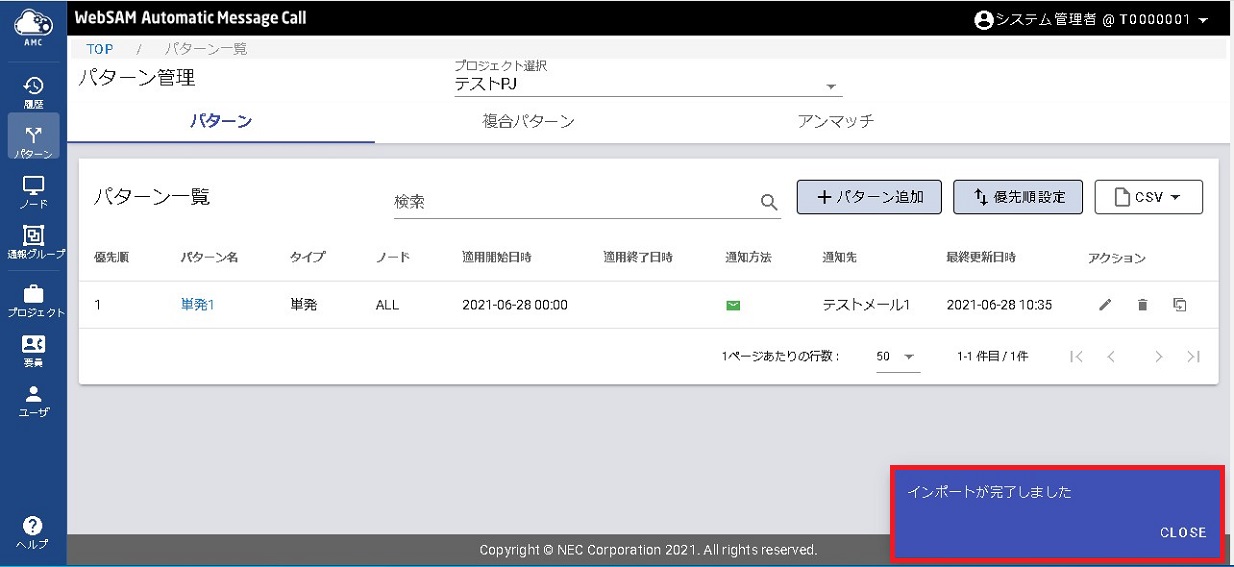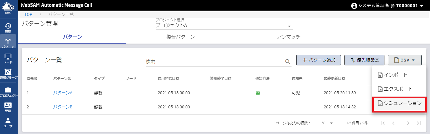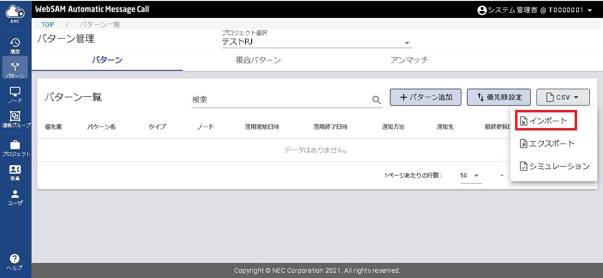 1. 画面左のメニューバーから、「ノード」、「要員」、「パターン」(複合パターンの場合は、更に「複合パターン」タブを選択)、「通報グループ」、「プロジェクト」、「ユーザ」のいずれかを選択して、管理画面を開き、画面右上の「CSV」プルダウンメニューから「インポート」をクリックします。