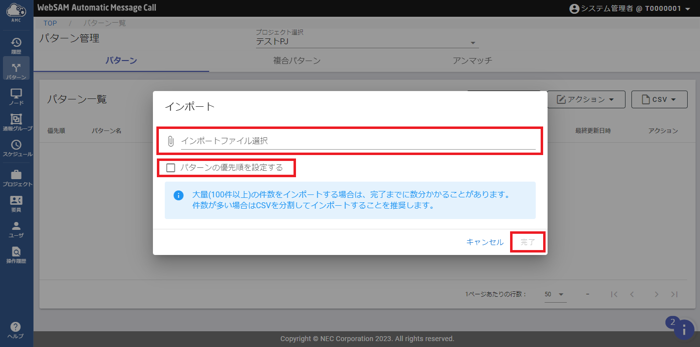 1. ダイアログでインポートするファイルを選択して完了をクリックします。パターンの場合は、[パターンの優先順を設定する]チェックボックスをチェックすると、入力ファイルの上から順に優先順を設定します。