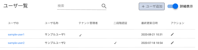 | 詳細表示 | テナント管理者のみ詳細設定を有効にすると、各ユーザの二段階認証の設定有無を確認することができます。 |
