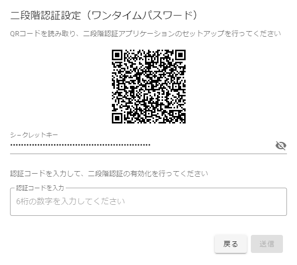 | 認証コード | 認証アプリケーションが発行した認証コードを入力して送信します。成功した場合は、次回のサインイン時から二段階認証が有効となります。失敗時は再設定をしてください。 |