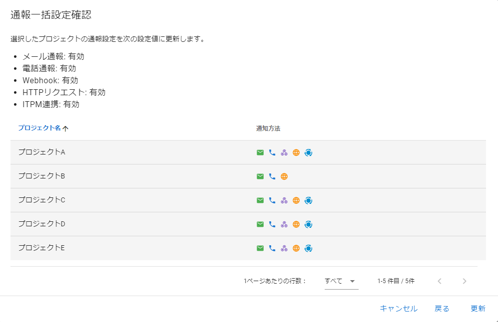 - 通報一括設定の確認画面が表示されるので、通報設定と選択したプロジェクトに問題ないか確認してください。確認画面で表示される通知方法は通報一括設定画面で設定した通報設定が反映されたものとなりますので、設定内容に問題がなければ「更新」をクリックします。
