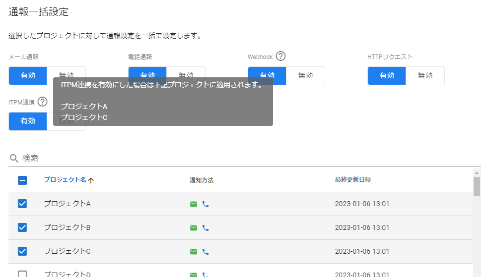 プロジェクト一覧画面から複数のプロジェクトの通報を一括で設定することができます。