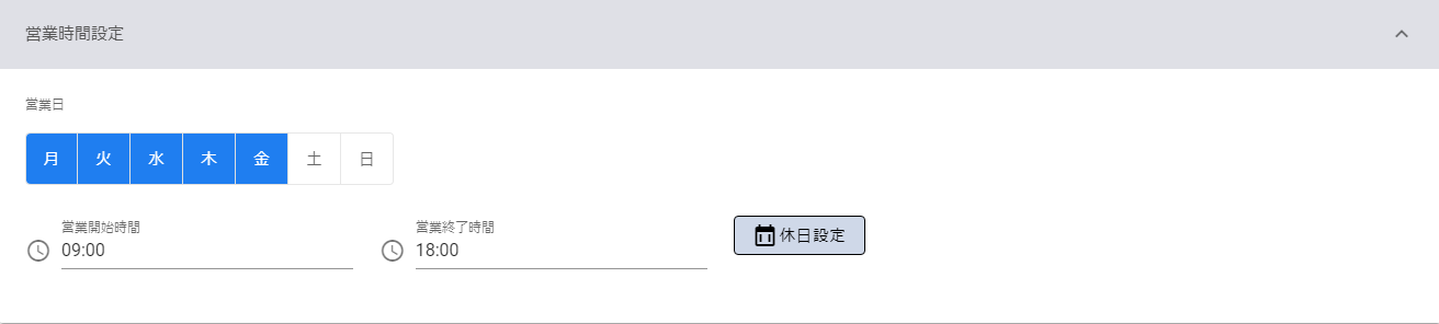 「営業開始時間」、「営業終了時間」は日またぎで時刻を指定することができます。 営業日を「日/月」、営業開始時間を「18:00」、営業終了時間を「06:00」と指定した場合は、下記の時間帯が営業時間となります。