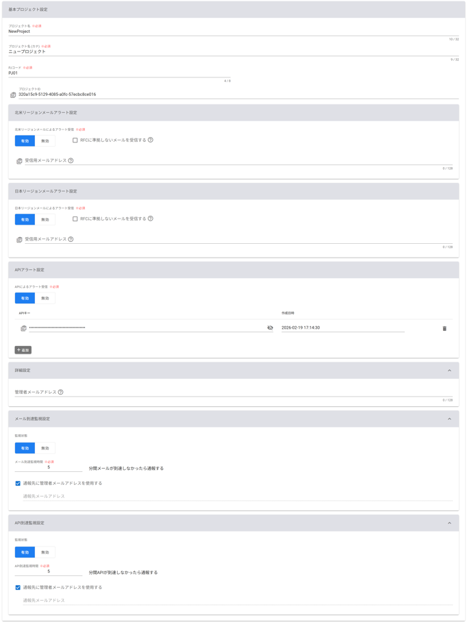 - APIアラート受信機能を利用するプロジェクトのみ、APIアラート設定を行えます。APIアラート受信機能をご利用になる場合は、サポートにお問い合わせください。