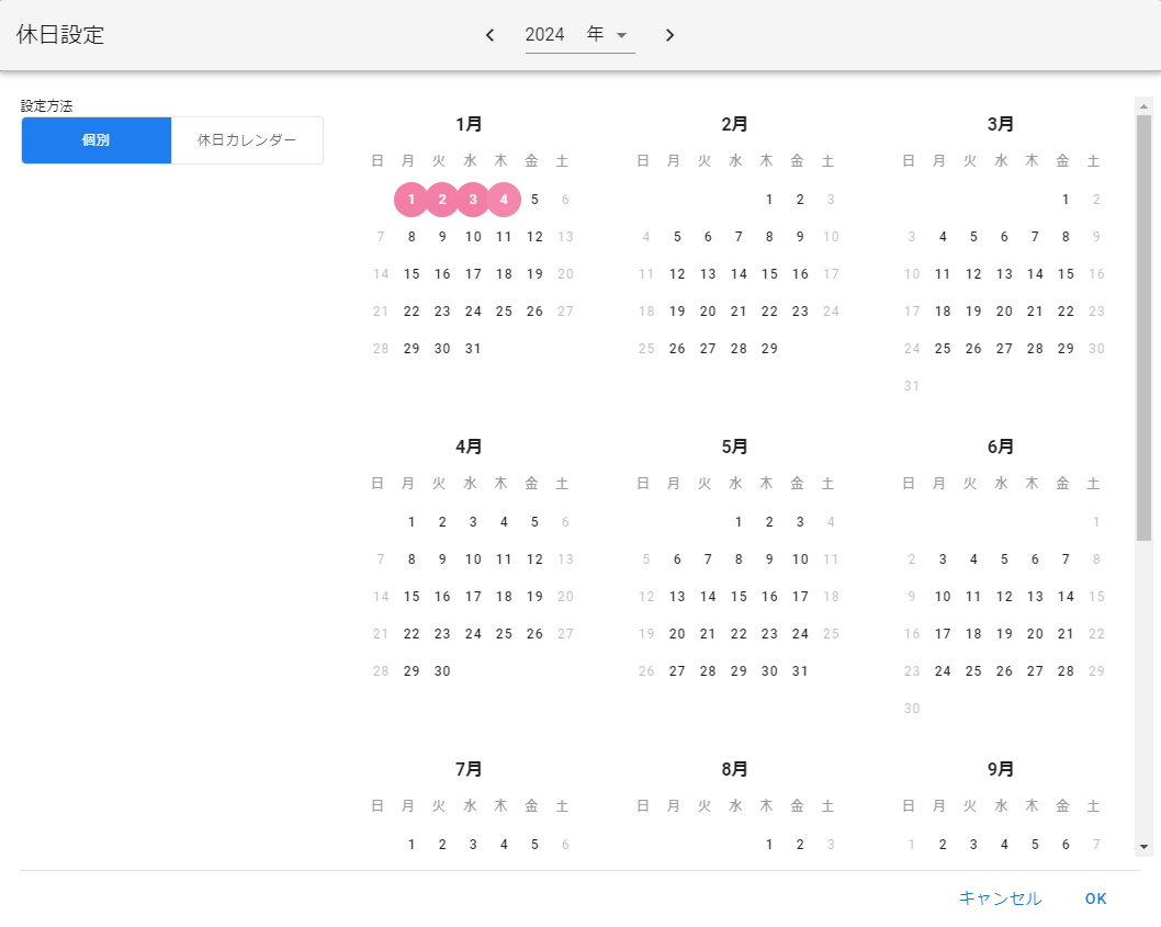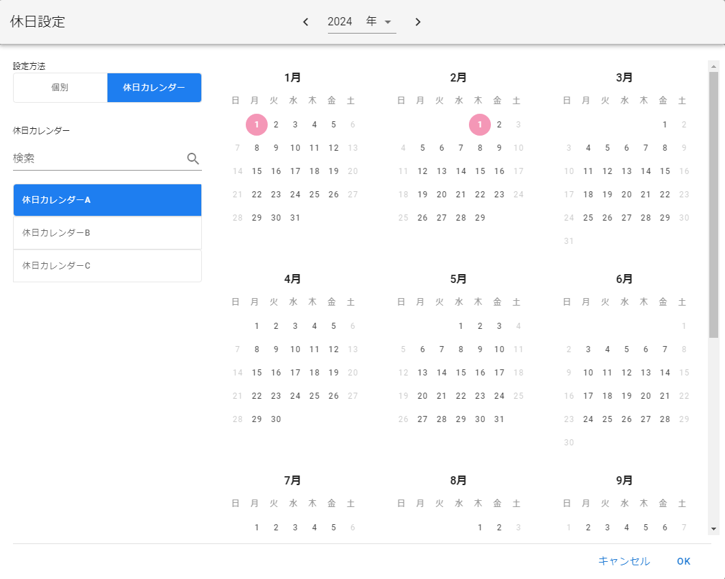 - 設定方法で休日カレンダーを選択した場合は、表示された日付はすべて読み取り専用となり変更は行えません。