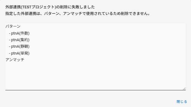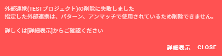パターンに紐づく外部連携を削除した場合は削除エラーが表示されます。 「詳細表示」をクリックすることで、紐ついたバターンを確認することができます。
