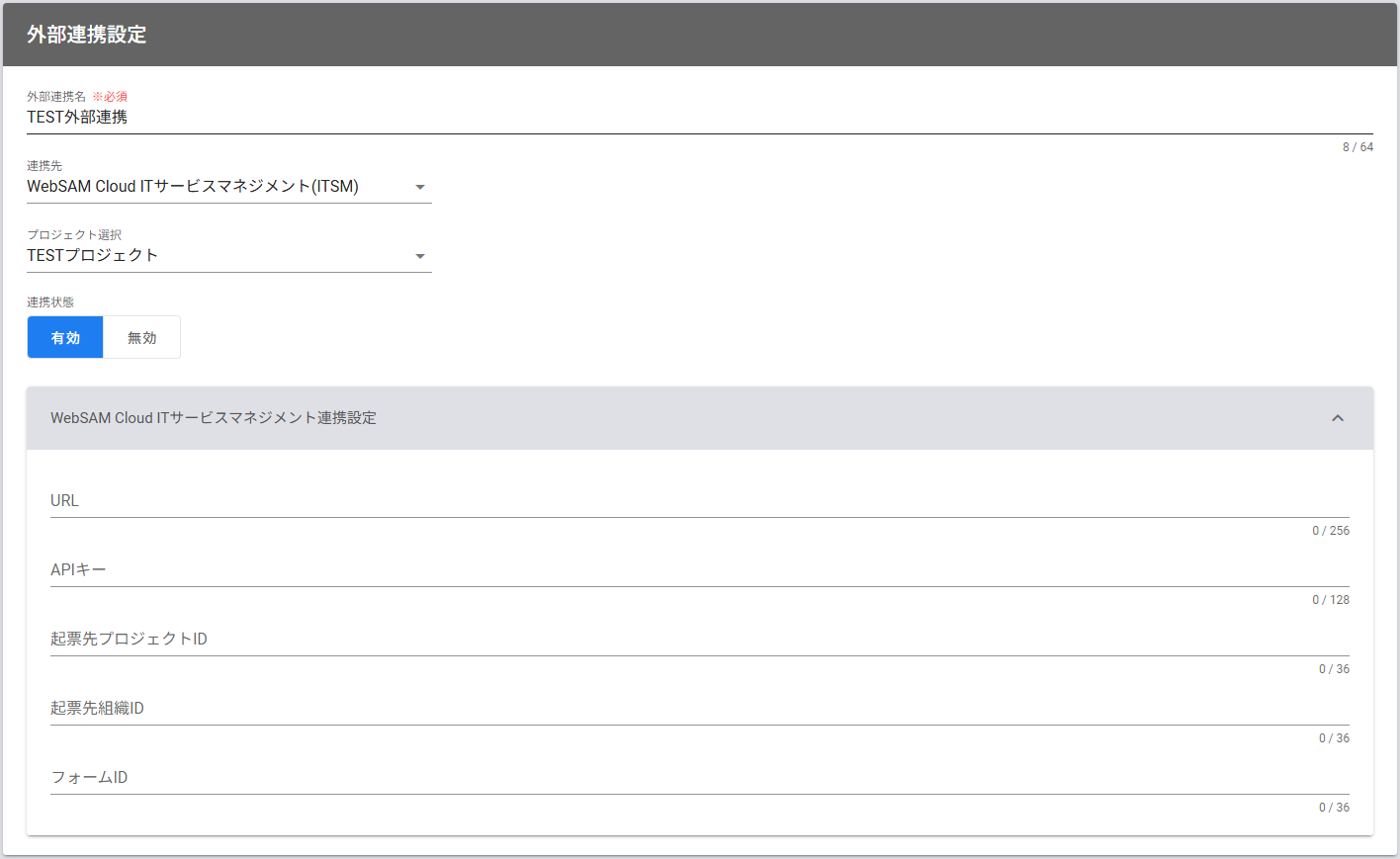 | 連携状態 | 外部連携を有効にするかどうかを指定します。「無効」を指定した場合、外部連携は行われません。 |