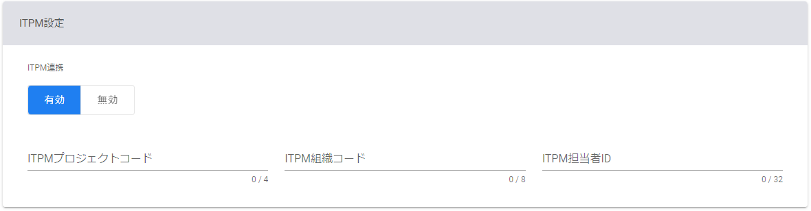 | ITPM連携 | ITPM連携の有効、無効を選択します。 | ITPM連携を利用するプロジェクトのみ有効にできます。ITPM連携については こちら を参照してください。すべてのプロジェクトでITPM連携を利用していない場合は、この項目は表示されません。 |
