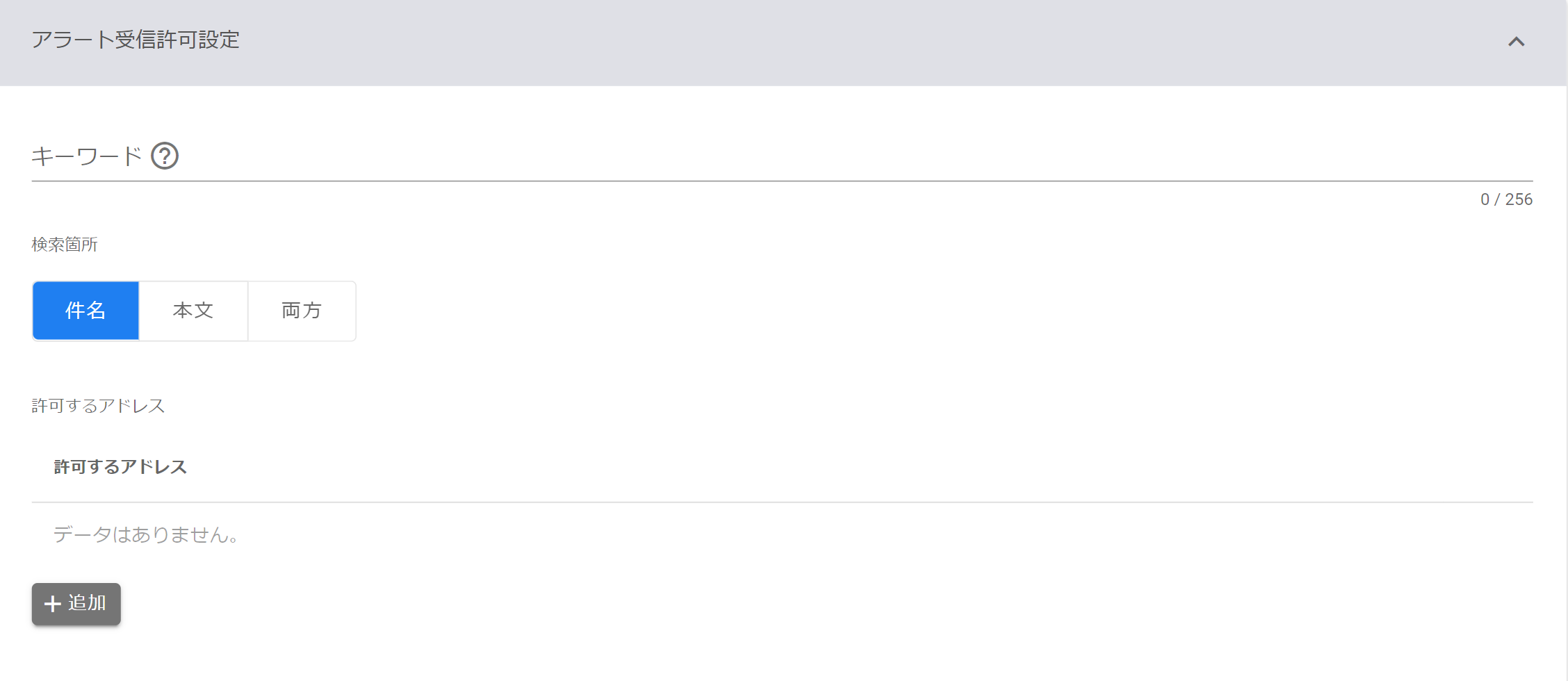 | 検索箇所 | キーワードをアラートメール、APIから検索する場所を指定します。「件名」「本文」「両方」から選択します。 | |