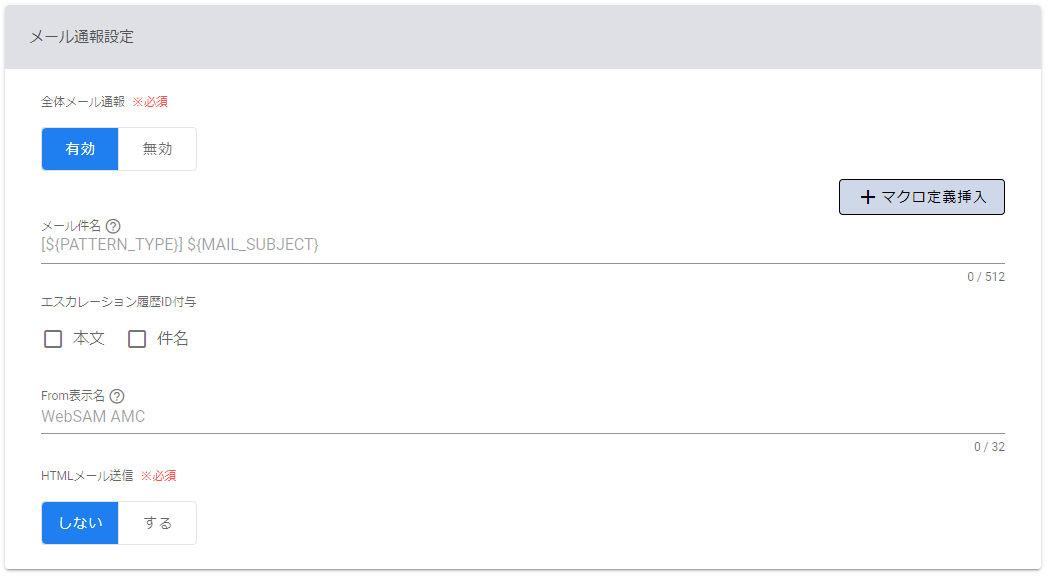 | メール件名 | メール通報時のメール件名を指定します。未指定の場合、「[${PATTERN_TYPE}] ${MAIL_SUBJECT}」となります。 | 「マクロ定義挿入」にて、パターン名やプロジェクト名などを指定可能です。メール通報のみが対象となります。 メール件名は最大で512文字であり、マクロ展開後の文字列が513文字以上の場合、512文字目までが件名に記載されます。 |